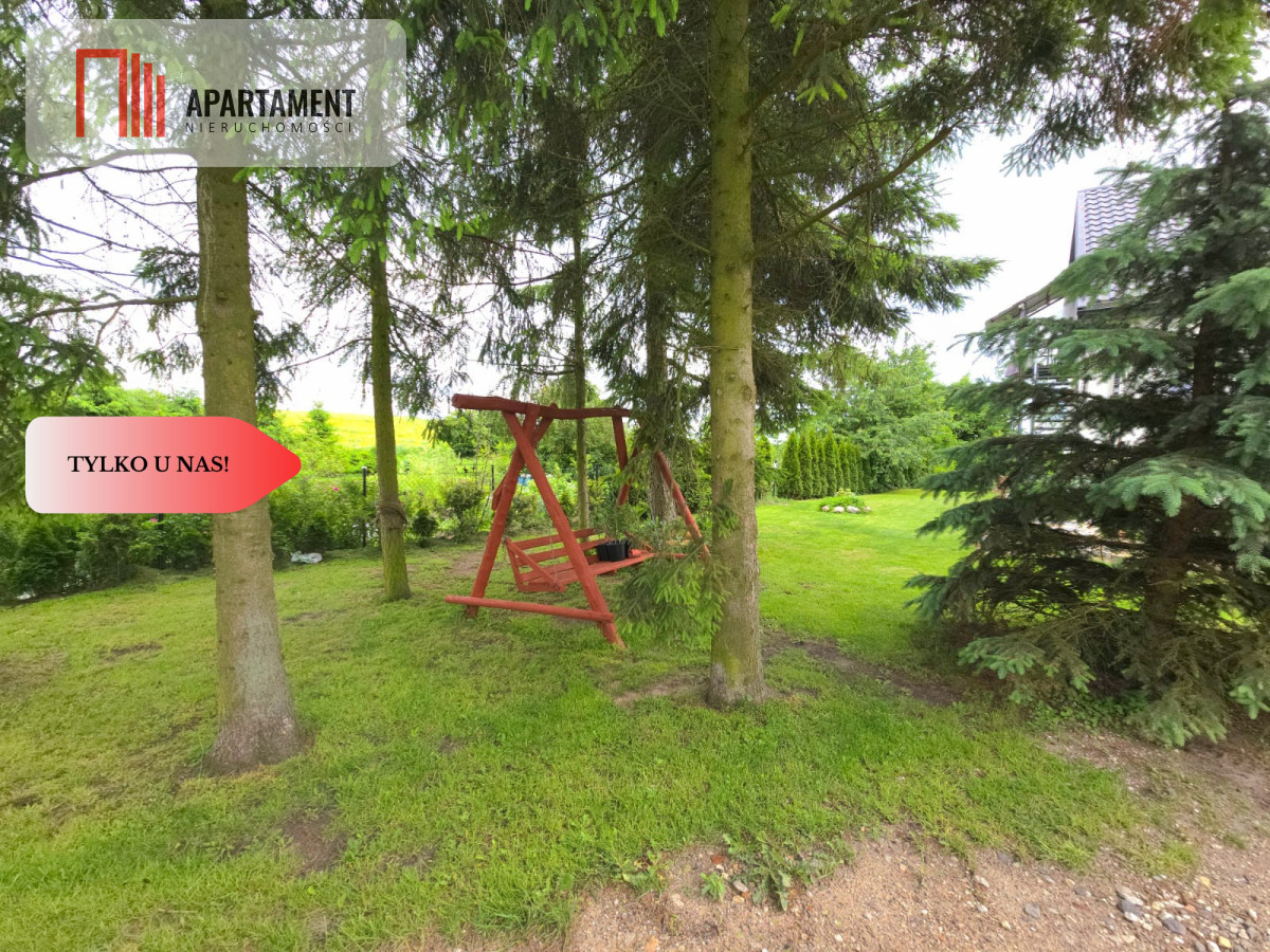 Ogród jest zadbany , pełen zieleni. Liczne nasadzenia roślin rabatowych, krzewów ozdobnych, świerków, drzew owocowych, tuj. Znajdziemy również taras i drewnianą huśtawkę - miejsce do odpoczynku i relaksu .