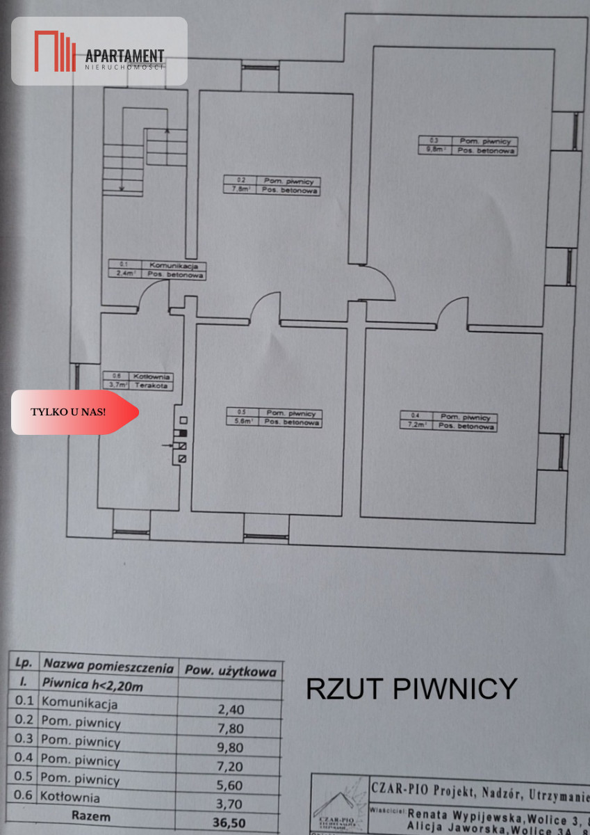 Powierzchnia piwnicy: 36,5 m²