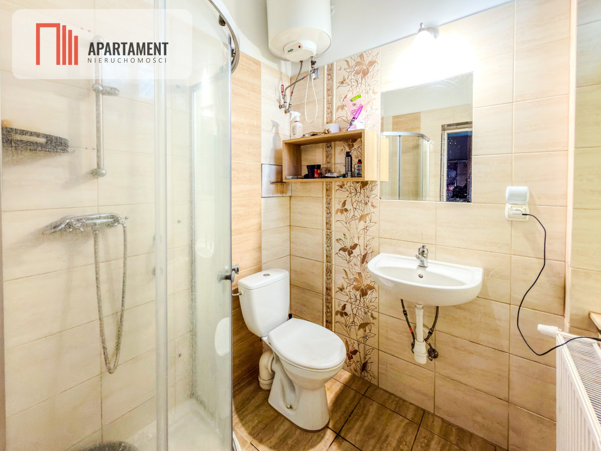 Układ: Wiatrołap, przestronny pokój z aneksem kuchennym oraz łazienka z prysznicem.