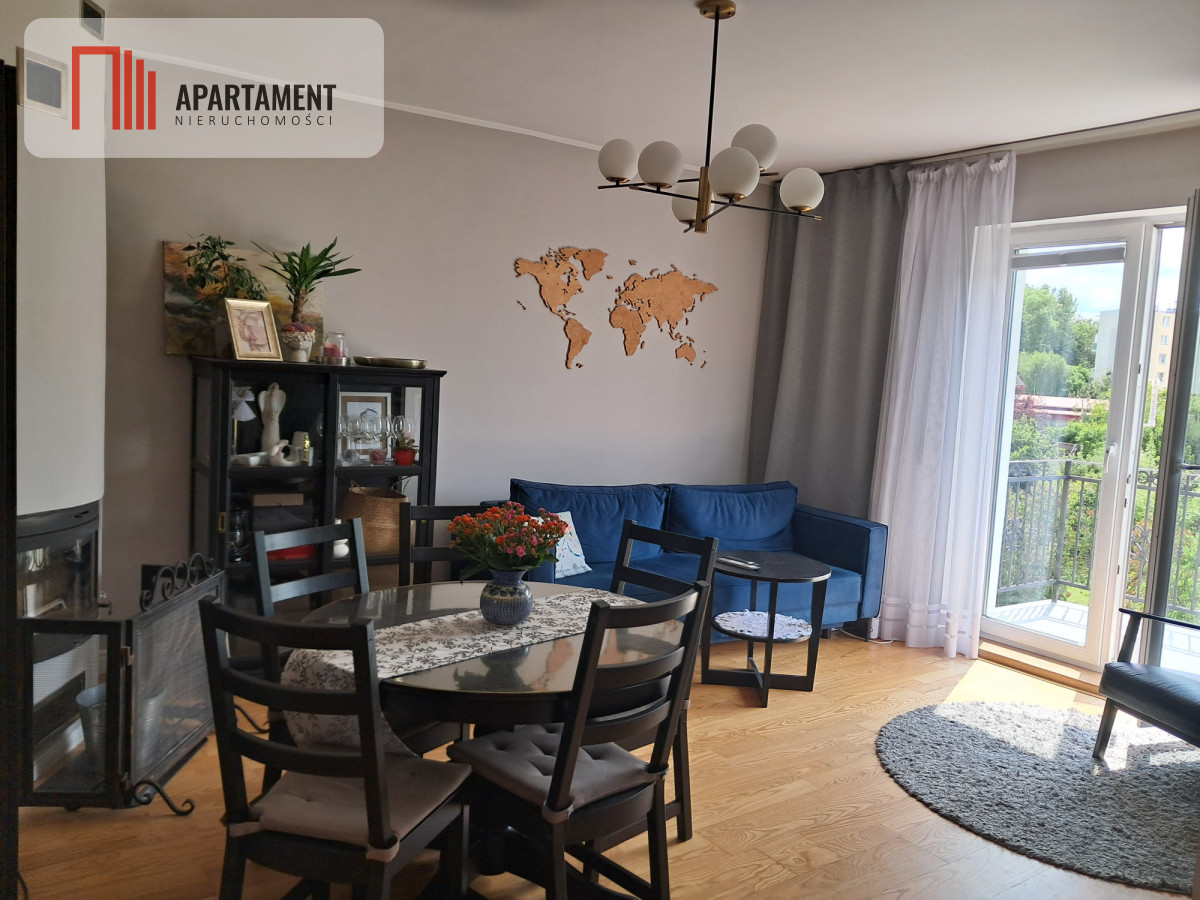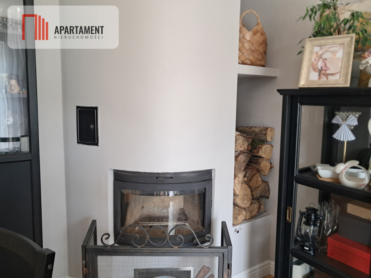przestronny salon z kominkiem, aneksem kuchennym i wyjściem na balkon,