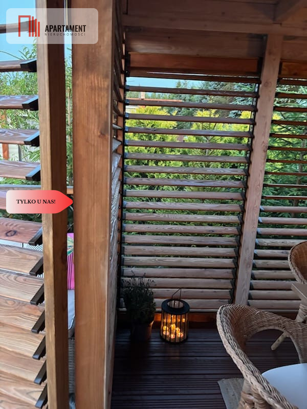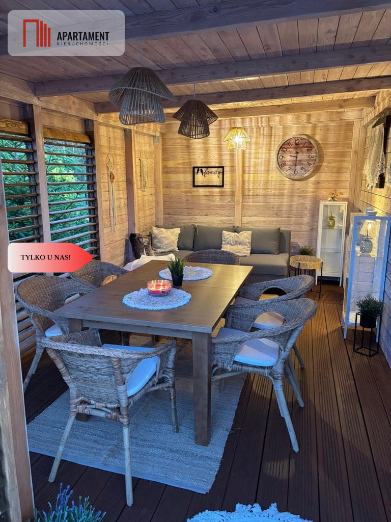 Dodatkowym atutem jest pięknie zagospodarowany taras zabudowany, który w sezonie letnim może pełnić rolę dodatkowego pokoju - idealnego miejsca do wypoczynku, spotkań z rodziną lub pracy w otoczeniu natury.