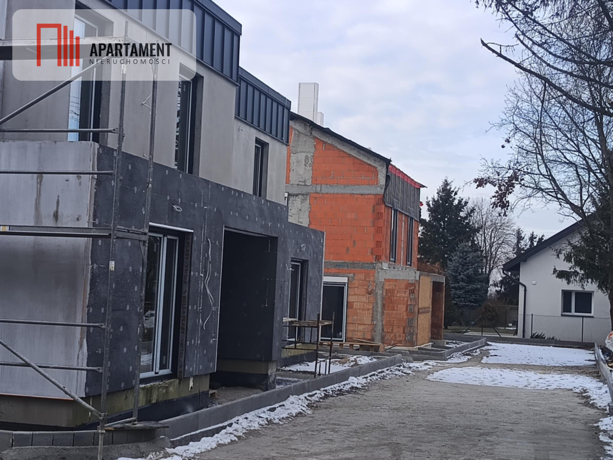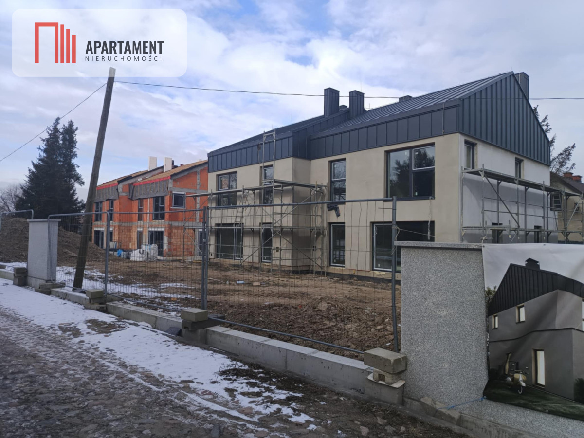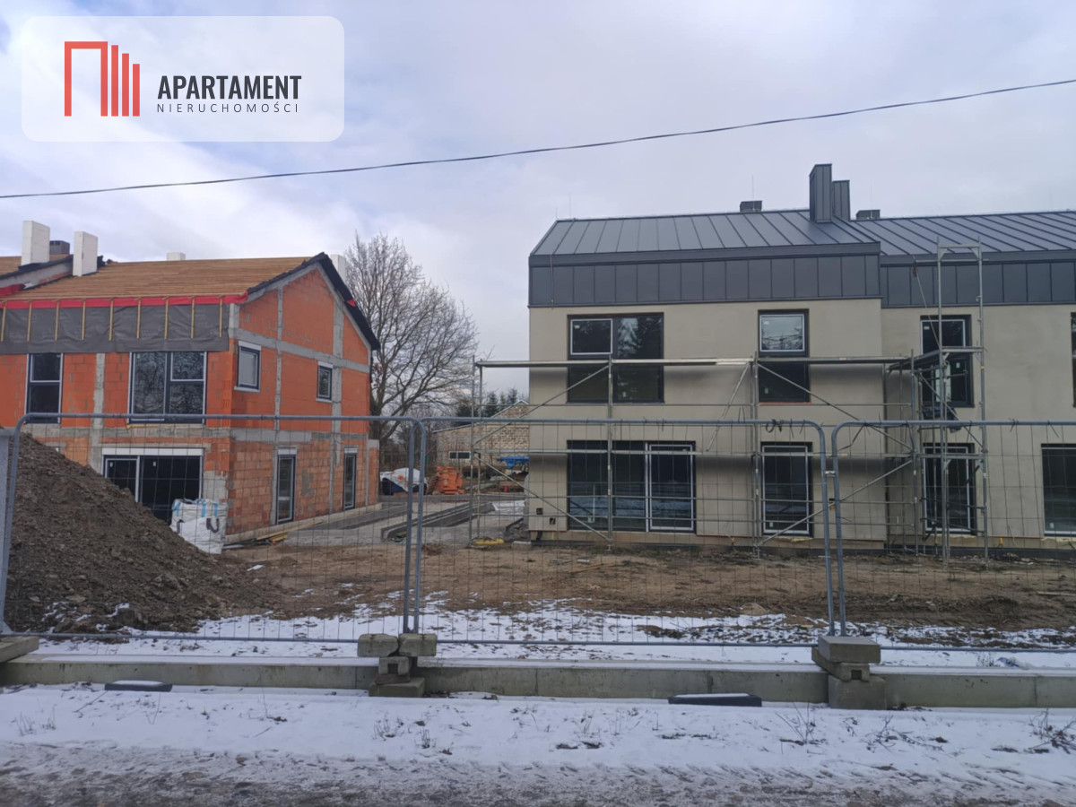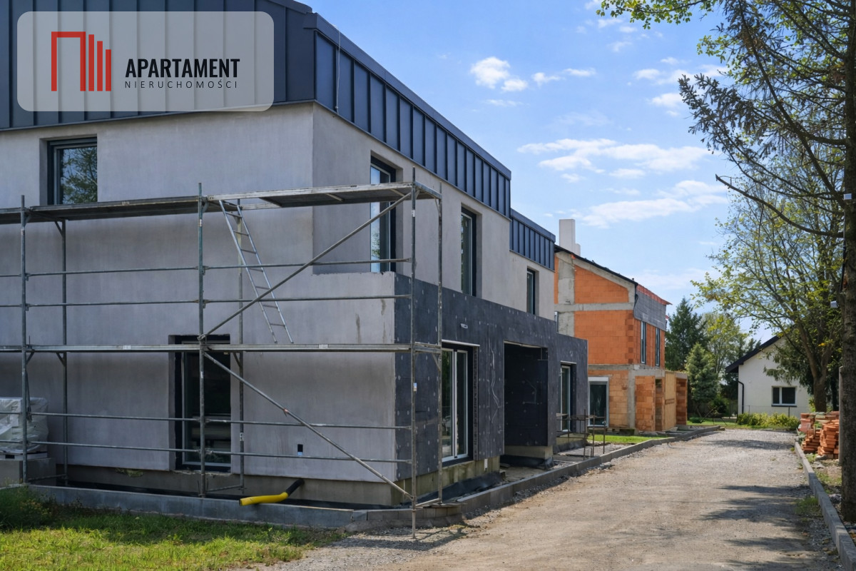Strop żelbetowy, schody zabiegowe prefabrykowane, na parterze i na piętrze tynki na ścianach oraz sufitach zagruntowane i wybiałkowane, dach ocieplony pianką PUR, płyty GK na poddaszu, wylewki podłogowe na obu kondygnacjach, ogrzewanie podłogowe na obu kondygnacjach, okna PCV trzyszybowe z ciepłym montażem i nawiewnikami higrosterowalnymi, rolety automatyczne w każdym oknie, rozprowadzona elektryka, kanalizacja, woda, ogrzewanie - pompa ciepła Beretta 8 kW, uzdatniacz wody. Dach - blacha panelowa Blachotrapez, balkony wykończone elegancką balustradą szklaną. Całkowicie wykończony teren wspólny: wjazd na posesję przez automatyczną bramę marki Wiśniowski z napędem firmy Nice, drogi wewnętrzne i miejsca parkingowe zewnętrzne wyłożone płytą ażurową.Dodatkowo, domy będą miały gotowe tarasy z wysokiej klasy płytki antypoślizgowej. W ogródku nawieziemy czarnoziem, dzięki czemu ta przestrzeń będzie od razu gotowa do własnej aranżacji. W częściach wspólnych sadzimy tuje i jabłonie.