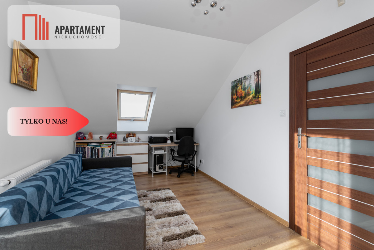 Do sprzedania zadbany dom wolnostojący na spokojnym osiedlu domów jednorodzinnych w miejscowości Prochowice, powiat legnicki, woj. dolnośląskie. Dom parterowy z poddaszem użytkowym z roku 2015, posadowiony na zagospodarowanej 10 arowej działce. Powierzchnia całkowita mierzy 100 m2 (użytkowa 80 m2) i na jego powierzchnię składa się: - parter: wiatrołap, kotłownia, łazienka, gabinet, salon z aneksem kuchennym; - piętro: 2 sypialnie (każda z garderobą), przestronna łazienka. Dom bardzo ładnie urządzony, gotowy do wprowadzenia. Wystawa okien dwustronna, kuchnia od wschodu, salon i ogród od strony zachodniej z widokiem na górę Śnieżkę. Na parterze wiatrołap, kotłownia, gabinet, łazienka z prysznicem, jasna kuchnia, meble kuchenne w zabudowie wraz ze sprzętem agd, z salonu jest wyjście na zadaszony taras a następnie zielony zadbany ogród z licznymi nasadzeniami drzew i krzewów. Na piętrze duża łazienka z wanną oraz 2 sypialnie, każda z własną garderobą. Ogrzewanie domu i c.w.u. piecem gazowym. W oknach rolety zewnętrzne. Ogrzewanie podłogowe oraz kaloryfery. Posesja w całości ogrodzona, brama wjazdowa na pilota. Przed domem duży wykostkowany podjazd na 4 auta. Na działce budynek gospodarczy o pow. 15 m2 oraz domek narzędziowy. Media miejskie: woda, kanalizacja, prąd, światłowód. Dojazd drogą gminną, asfaltową. W okolicy szkoła, przedszkole, sklepy, punkty usługowe, kościół, banki, przychodnia rejonowa. Do stacji PKP Szczedrzykowice 8 km (dojazd do stacji Wrocław Główny 45 minut), Legnicy 18 km, Lubina 18 km, Lubiąża 12 km, do Wrocławia 55 km (dojazd DK 94). Nieruchomość idealnie wpasuje się potrzeby rodziny lub pary.