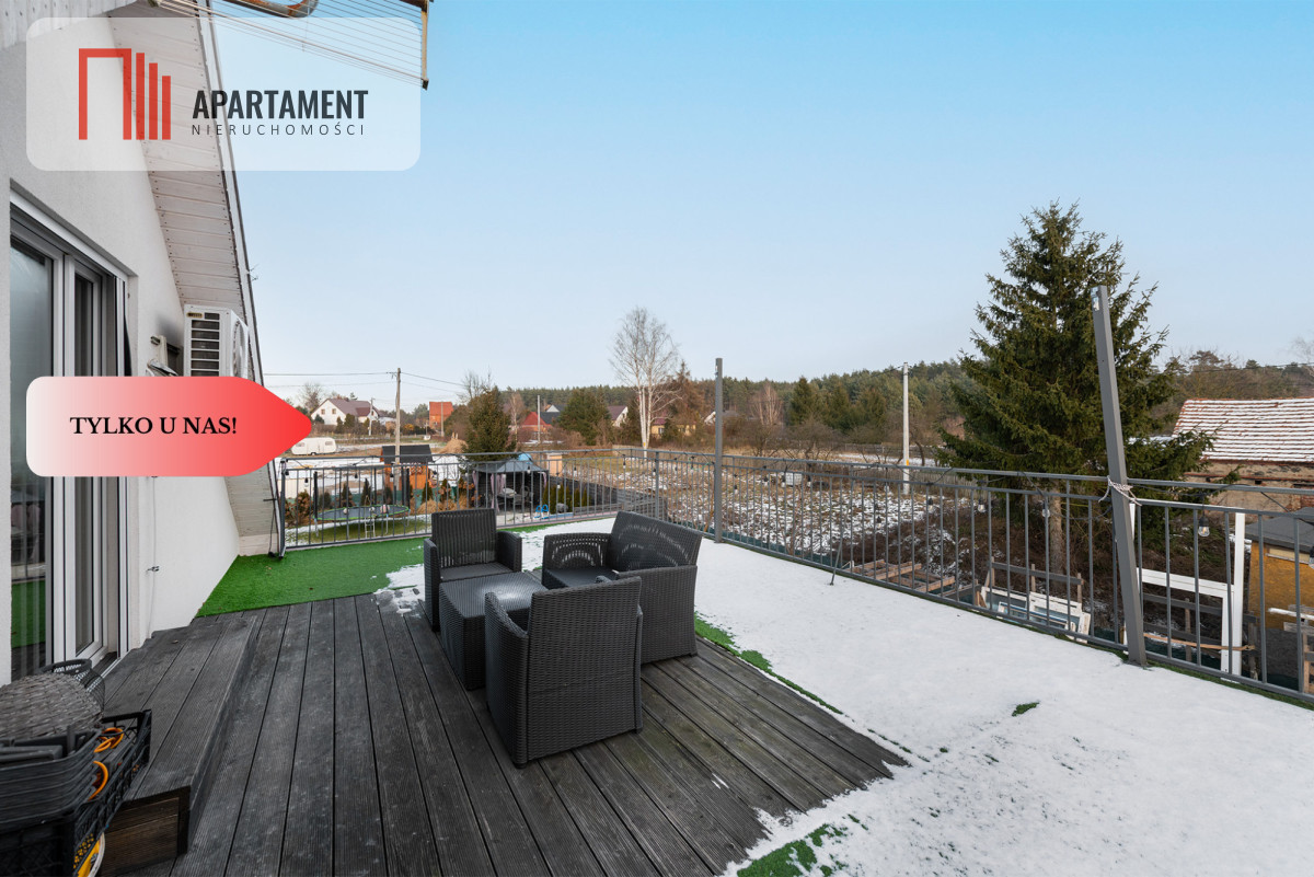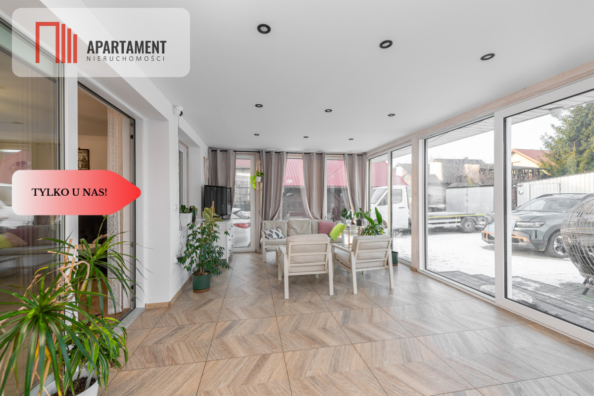 Dom wybudowany w 2008 r Powierzchnia użytkowa wynosi 240 m2 , w skład której wchodzi parter : kuchnia z salonem, łazienka ,wc oraz hol z którego można przejść do pomieszczenia z którego można przeznaczyć na pokój albo garaż ( obecnie jest biuro) oraz ogród zimowy z którego można przejść na 1 piętro z osobnym wejściem.
