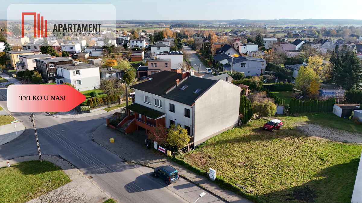 Dom w zabudowie szeregowej dobudowany do istniejącego z lewej strony budynku patrząc od frontu. Z prawej strony trzy niezabudowane działki, więc budynek jest skrajnym segmentem. Do nieruchomości prowadzi droga, w której właściciel posiada udział o wielkości 12/42 - działka ta stanowi jednocześnie dojazd, jak i miejsca parkingowe.