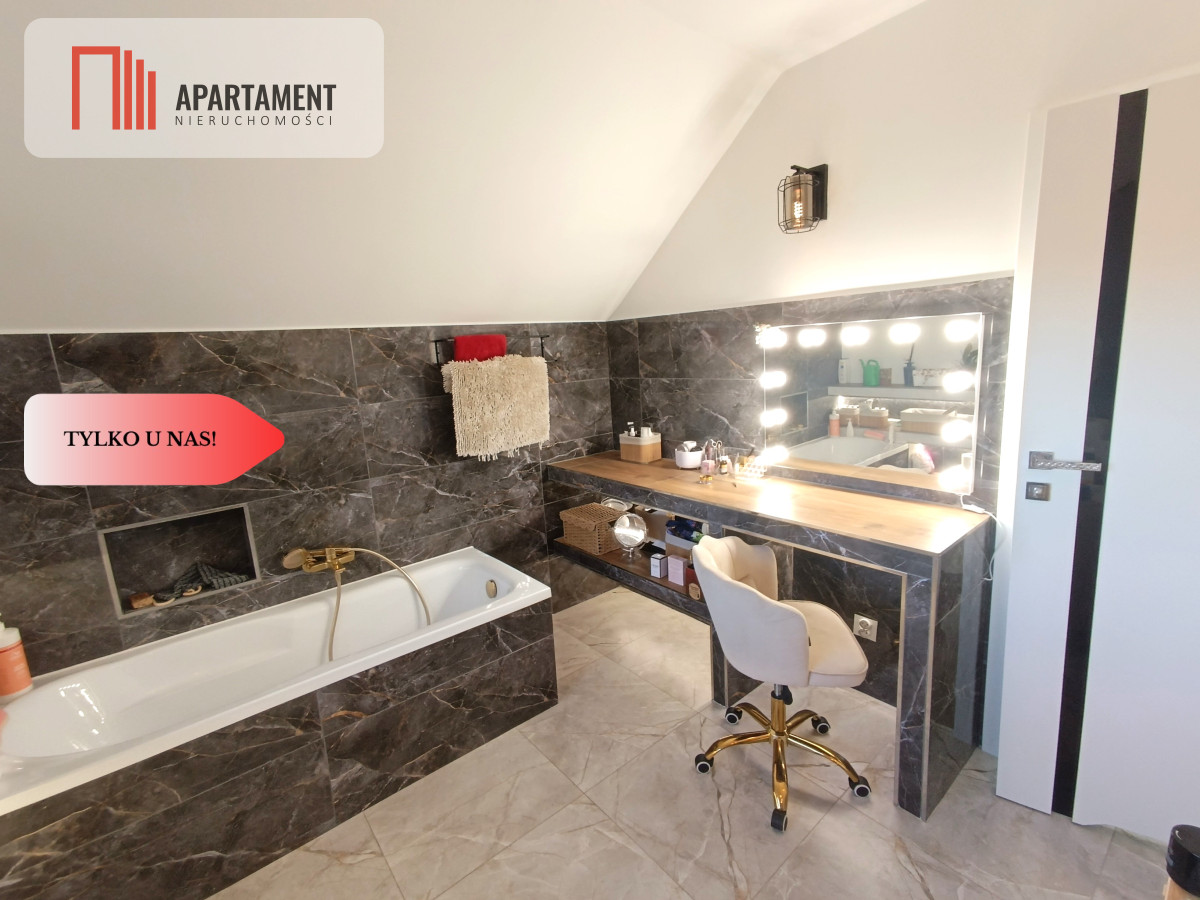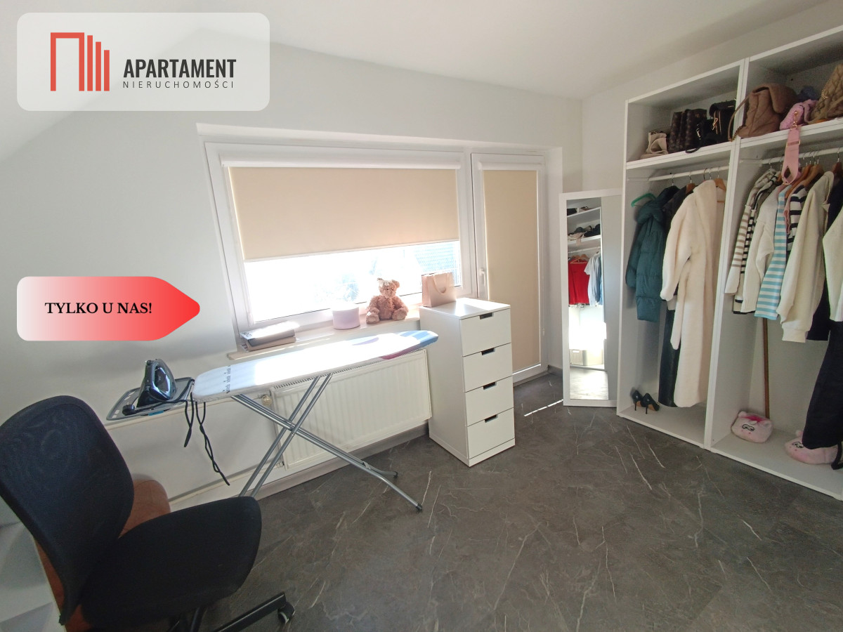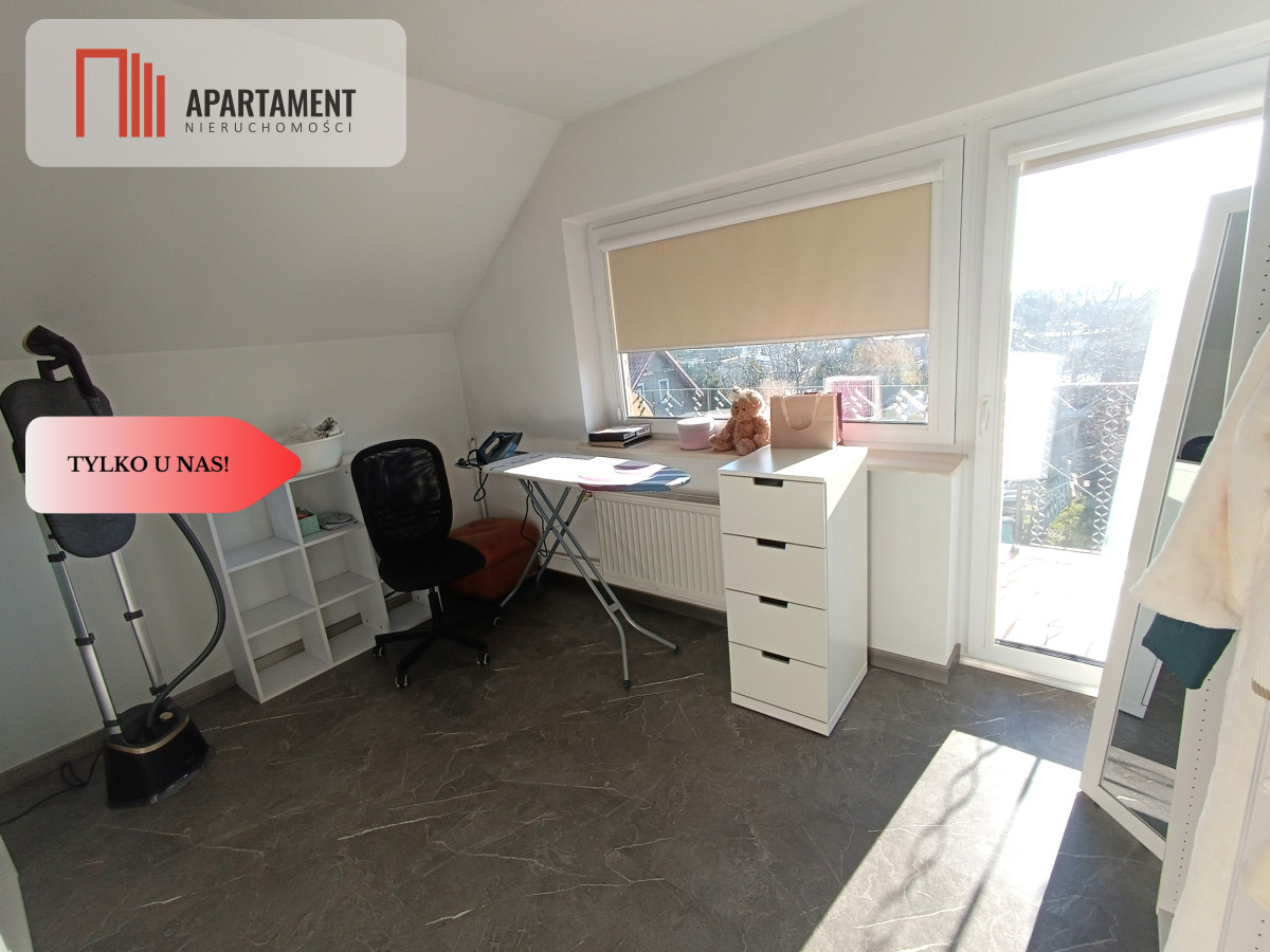 - Piętro (część prywatna): Ta kondygnacja to prawdziwa oaza spokoju. Znajduje się tu przestronna sypialnia oraz praktyczny pokój/gabinet, w których dla najwyższego komfortu zainstalowano klimatyzację. Dodatkowy pokój idealnie sprawdzi się jako garderoba lub pokój gościnny. Dopełnieniem jest duża łazienka z wanną.