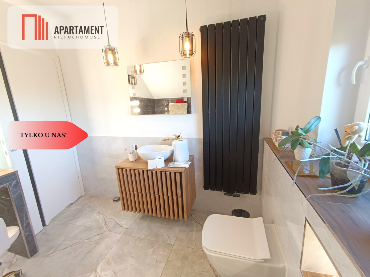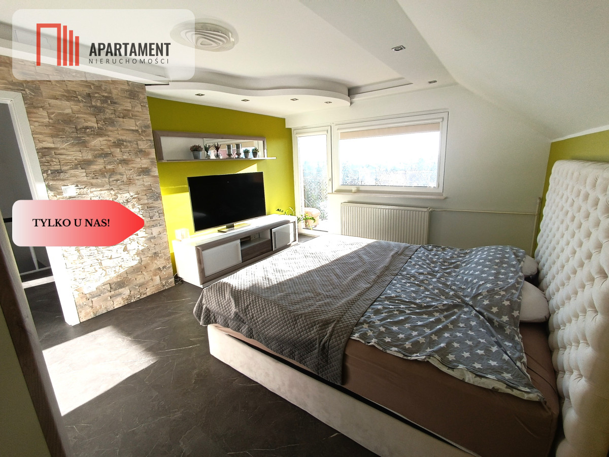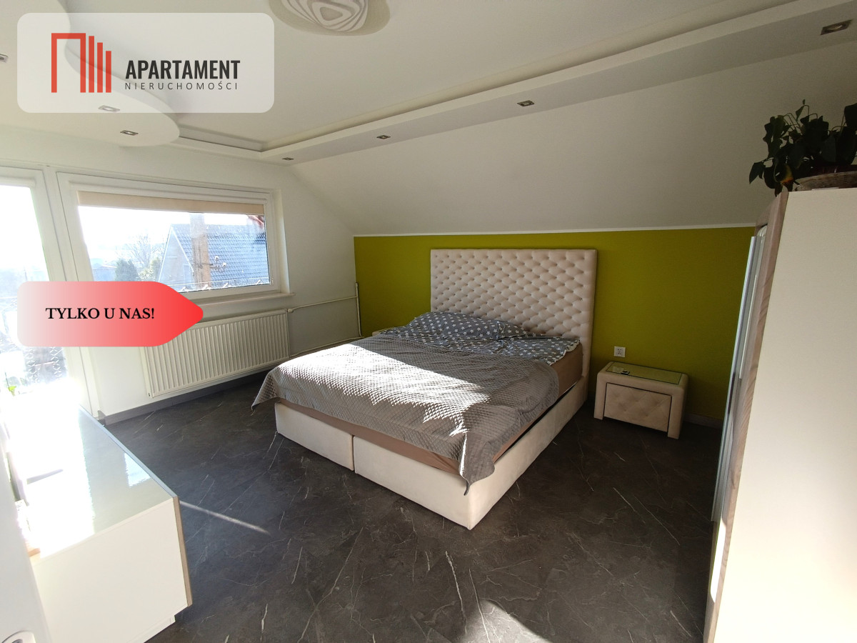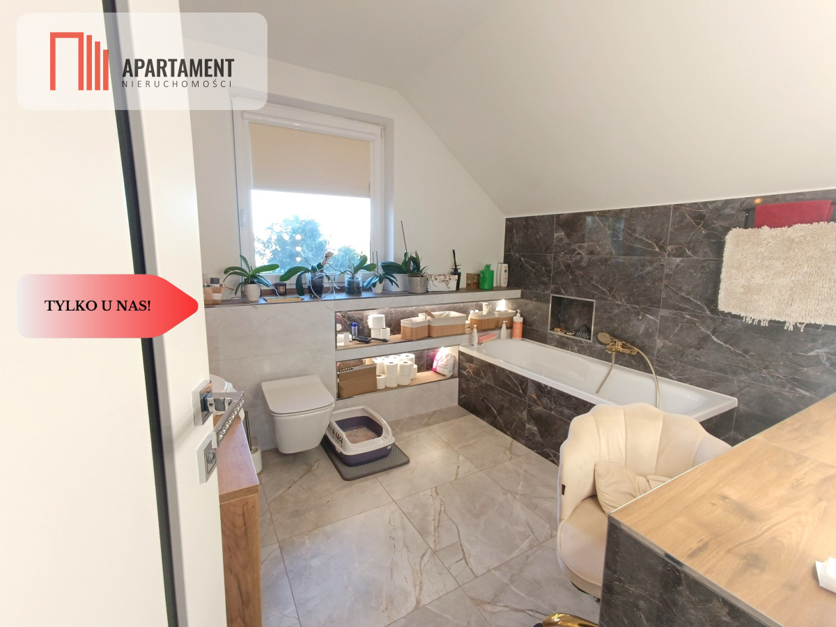 - Piętro (część prywatna): Ta kondygnacja to prawdziwa oaza spokoju. Znajduje się tu przestronna sypialnia oraz praktyczny pokój/gabinet, w których dla najwyższego komfortu zainstalowano klimatyzację. Dodatkowy pokój idealnie sprawdzi się jako garderoba lub pokój gościnny. Dopełnieniem jest duża łazienka z wanną.