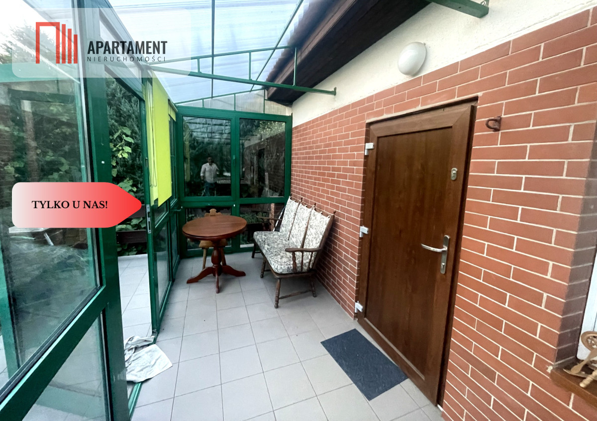 Przed domem ogród zimowy z miejscem do wypoczynku.
