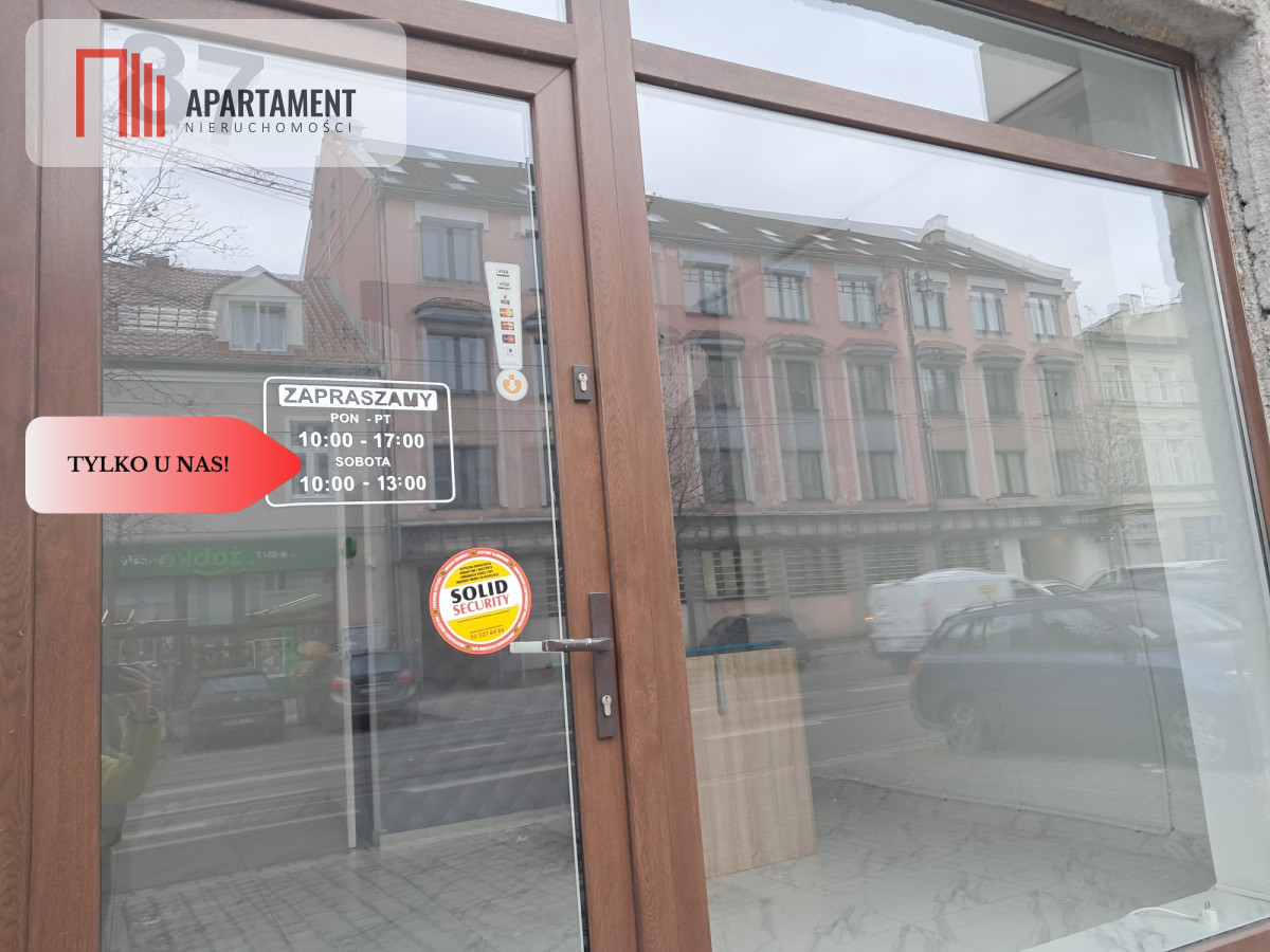 Lokal posiada dużą witrynę, która nie tylko zapewnia świetne doświetlenie wnętrza, ale również daje możliwość atrakcyjnej ekspozycji produktów lub usług. Istnieje też możliwość montażu szyldu, dzięki czemu Twoja marka będzie dobrze widoczna już z daleka.