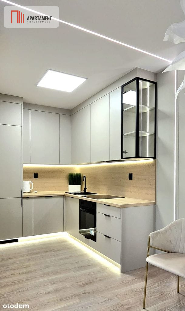 Nowoczesne wykończenie w wysokim standardzie, z wysokiej jakości materiałów przy ulicy Tadeusza Kościuszki. Meble kuchenne wykonane na wymiar. Nowe AGD - lodówka, piekarnik, płyta indukcyjna, okap, zmywarka.