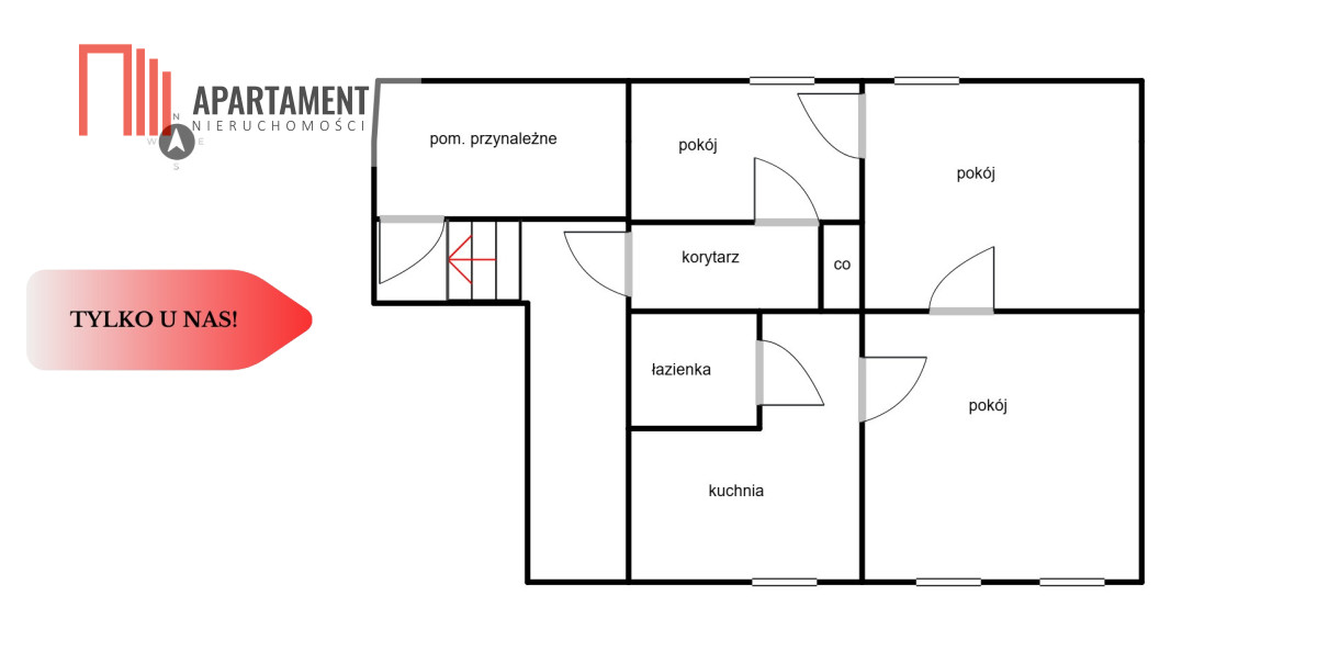 Układ pomieszczeń: 3 pokoje (przechodnie), kuchnia, łazienka, korytarz oraz pomieszczenie pomocnicze z osobnym wejściem z korytarza (możliwość połączenia z mieszkaniem).