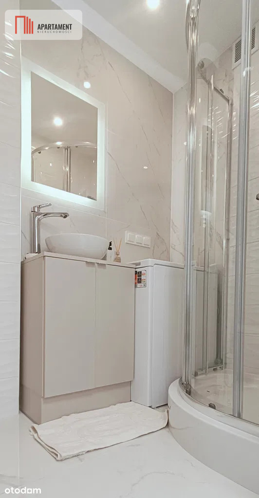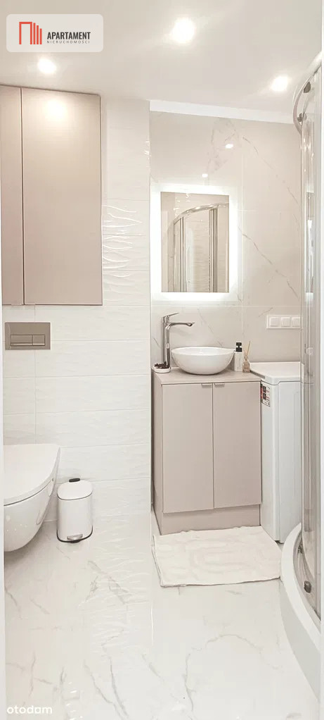 - Łazienka - wykończona w eleganckim stylu, z dużym lustrem LED, kabiną prysznicową, podwieszanym WC, szafkami w zabudowie, pralką i efektowną umywalką nablatową