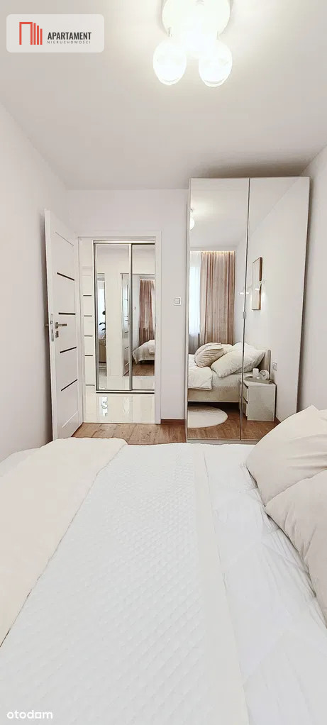 - Sypialnia - przytulna, z dużym łóżkiem małżeńskim, pojemną szafą z lustrami, nowoczesnym oświetleniem i dodatkami tekstylnymi